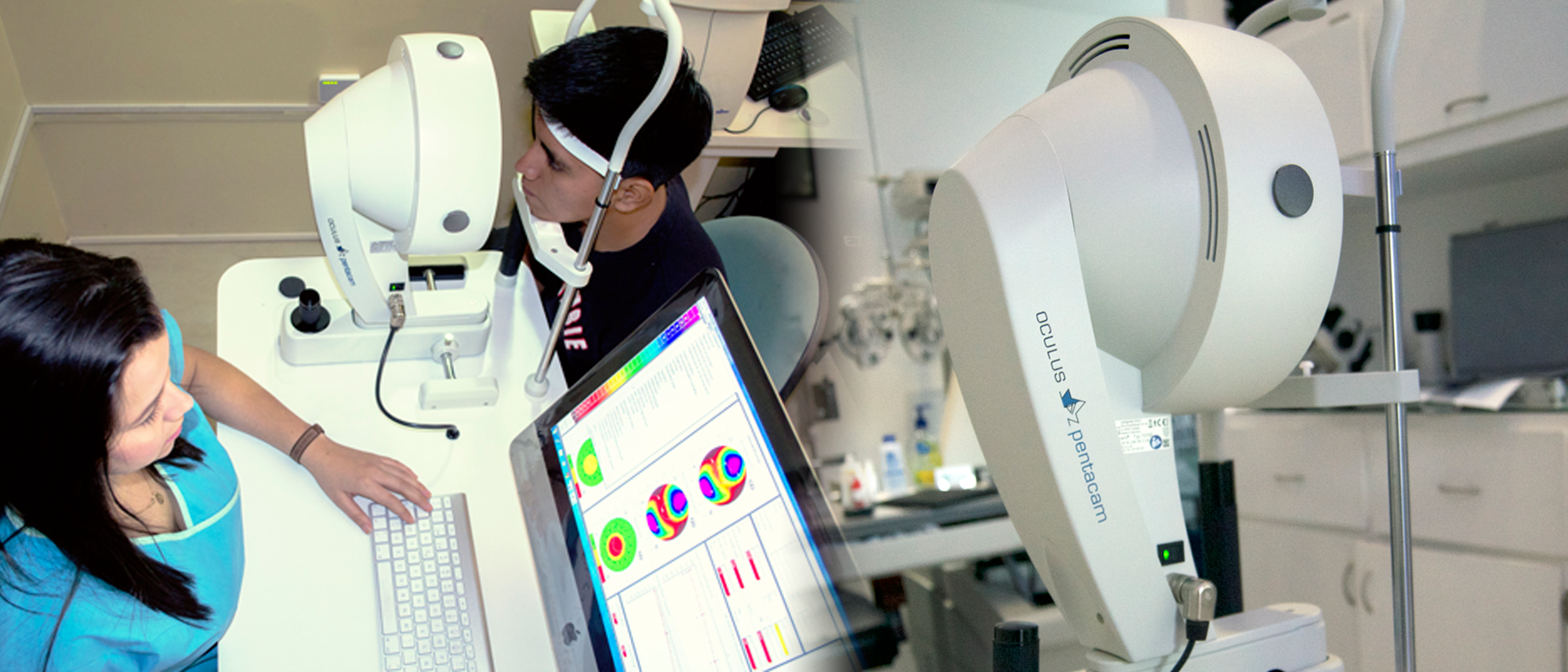 Pentacam es un equipo novedoso que permite explorar mediante una cámara Scheimpflug, tanto la cara anterior como la posterior de la córnea, así como el resto del polo anterior, de forma fácil y rápida.Las ventajas de imágenes rotatorias son la medición precisa de la córnea central, la corrección de los movimientos del ojo, la fijación sencilla para los pacientes, el tiempo de recuperación muy corto.